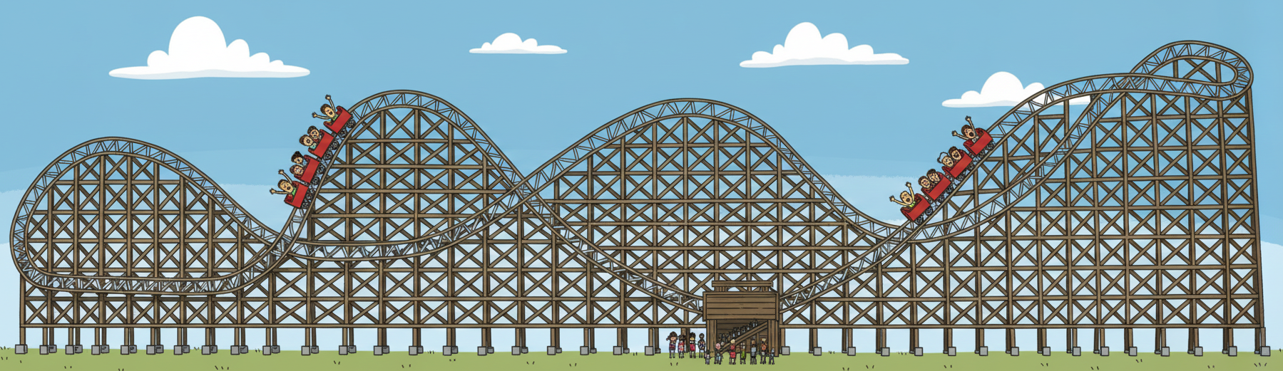 Imagine a roller coaster. I drew one here so you do not have to imagine it. Two trains of five cars are zooming along. The riders are screaming with a mix of terror and joy. It is fast. It feels like 100 mph. It is thrilling.