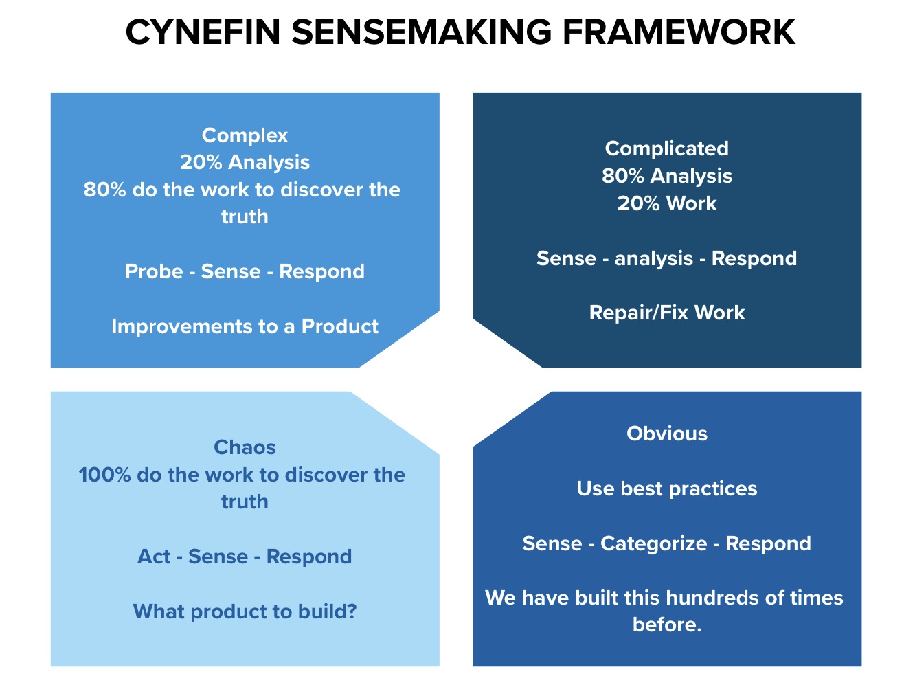 An attempt has been made to model a world where there is a continuum of work from simple, repeatable, predictable work and unpredictable, chaotic, high-VUCA work. It is the Cynevin Sense-Making Framework. Pronounce it like “Kin-evin.” It rhymes with Kevin.