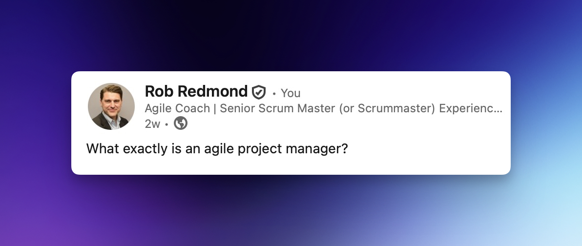 And yet I don’t know what an Agile Project Manager is supposed to be. I decided to take my question public on LinkedIn and ask people what this job entails and uncover whatever it is that I don’t know about why a company would think this job is useful and what tasks it performs.