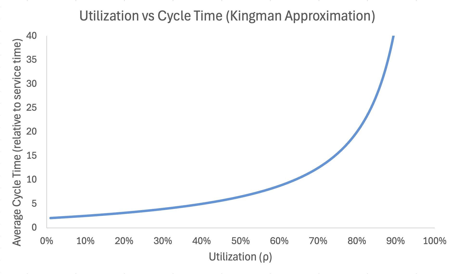 As utilization approaches capacity, wait times grow nonlinearly. The chart above demonstrates cycle time acceleration as utilization increases. Controlling utilization through WIP constraints does not reduce variability. It reduces the impact of variability on flow. The greater the variability in arrivals or service time, the steeper this curve becomes.