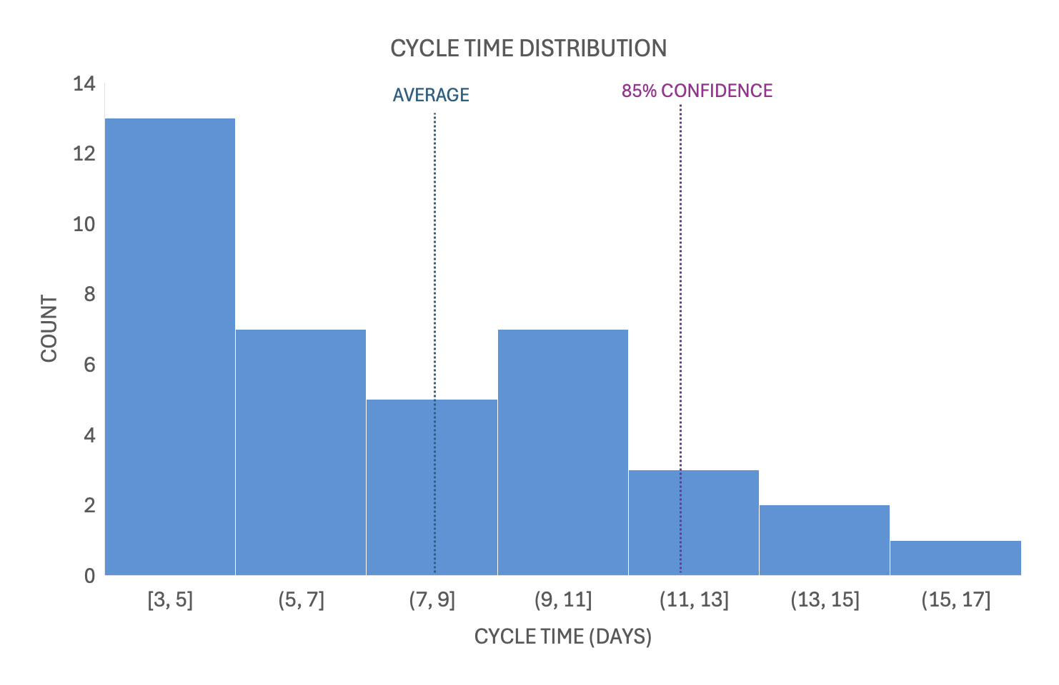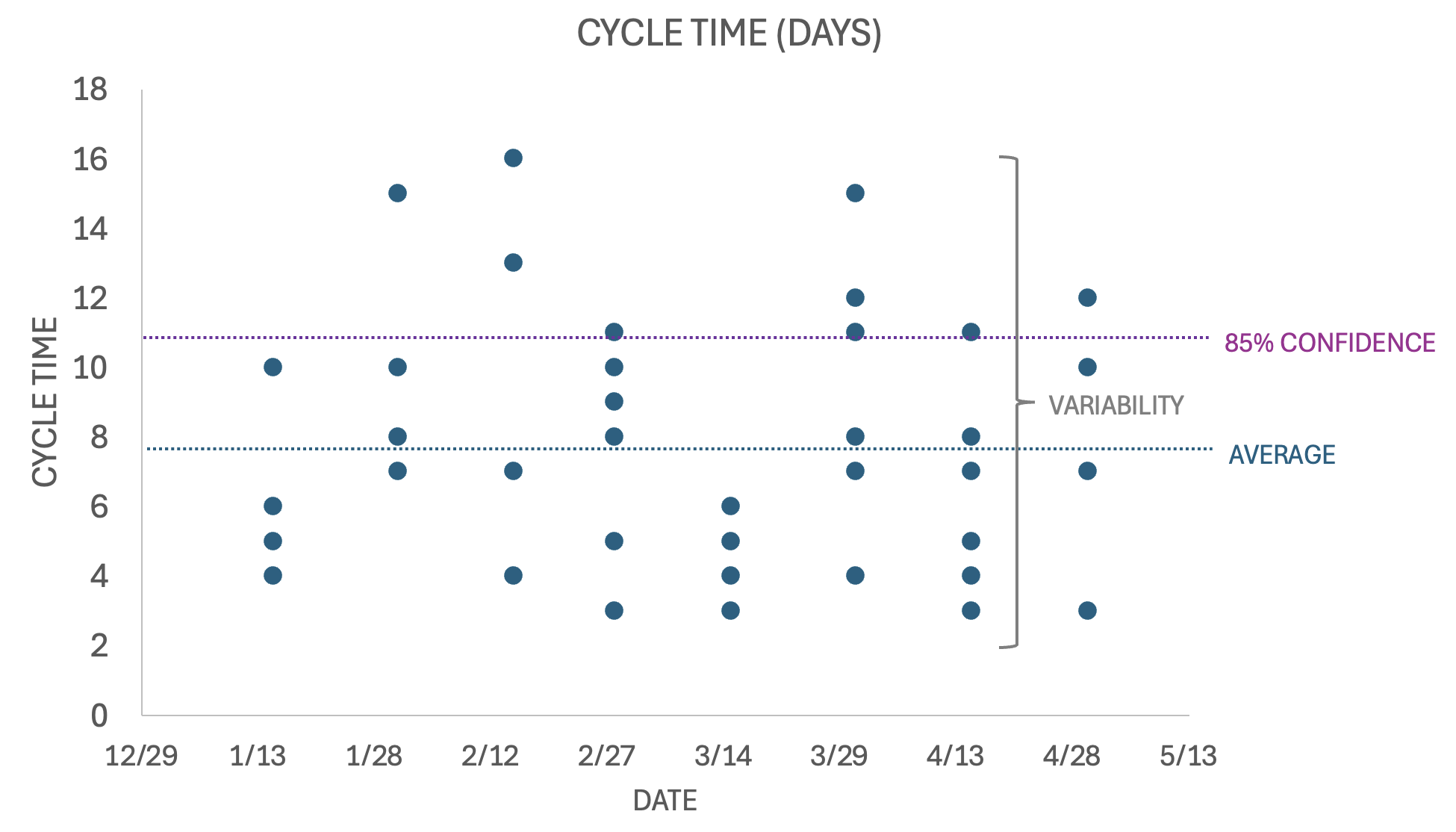 Statistically, this spread can be described using measures such as standard deviation and percentiles. Standard deviation measures how far observations tend to deviate from the mean. Percentiles answer a more practical question: “What percentage of work finishes within a given time?” For example, saying that 85 percent of items complete within twelve days is often more useful for planning than quoting the average.
