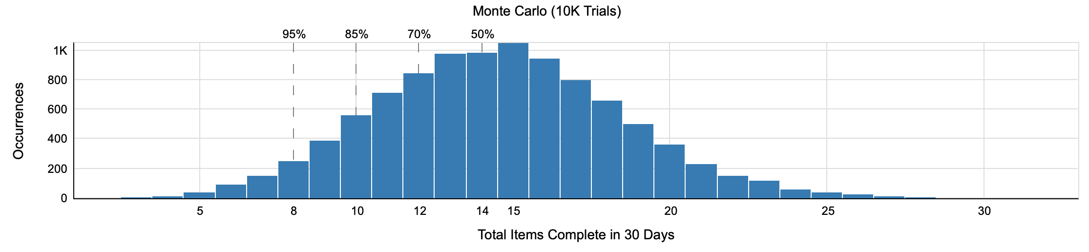 Predictability in software development is best achieved through flow metrics – not story points or hour/money guesses. Measuring cycle time, work-in-process, throughput, and item aging are incredibly valuable, and the pile of data they provide can be tossed into a Monte Carlo simulation. That simulation will provide a probability for current or future work to be completed which is based in historical evidence rather than estimations (guesses).