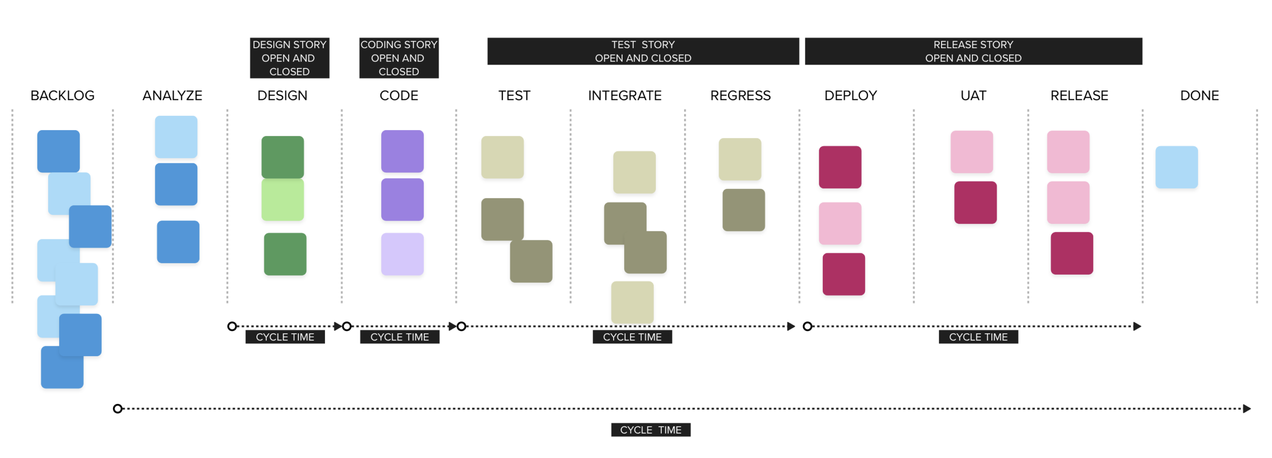Some teams create separate design, coding, and testing stories based on phases in a lifecycle. When work is divided this way, end-to-end cycle time becomes invisible because each card represents only a portion of the overall effort. Cards are opened and closed within each phase, and a new card is created for the next phase. As a result, no single item represents the full journey from start to finish.