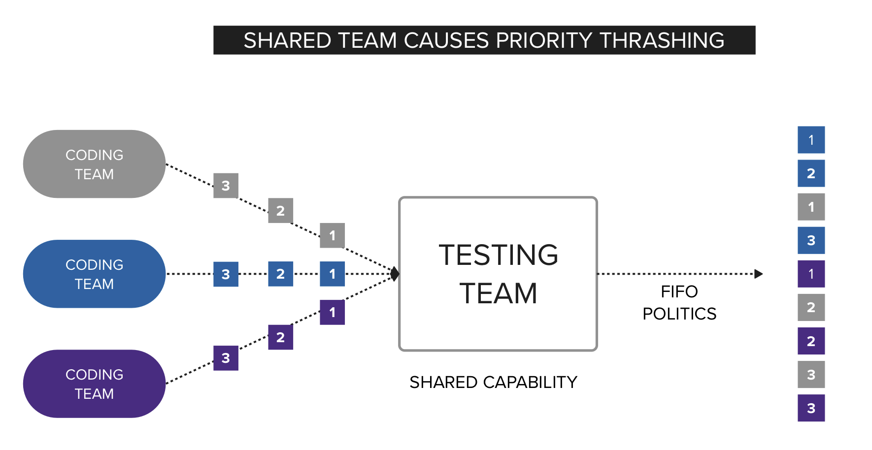 - Queueing → Many teams depend on one group, so work accumulates in front of it.