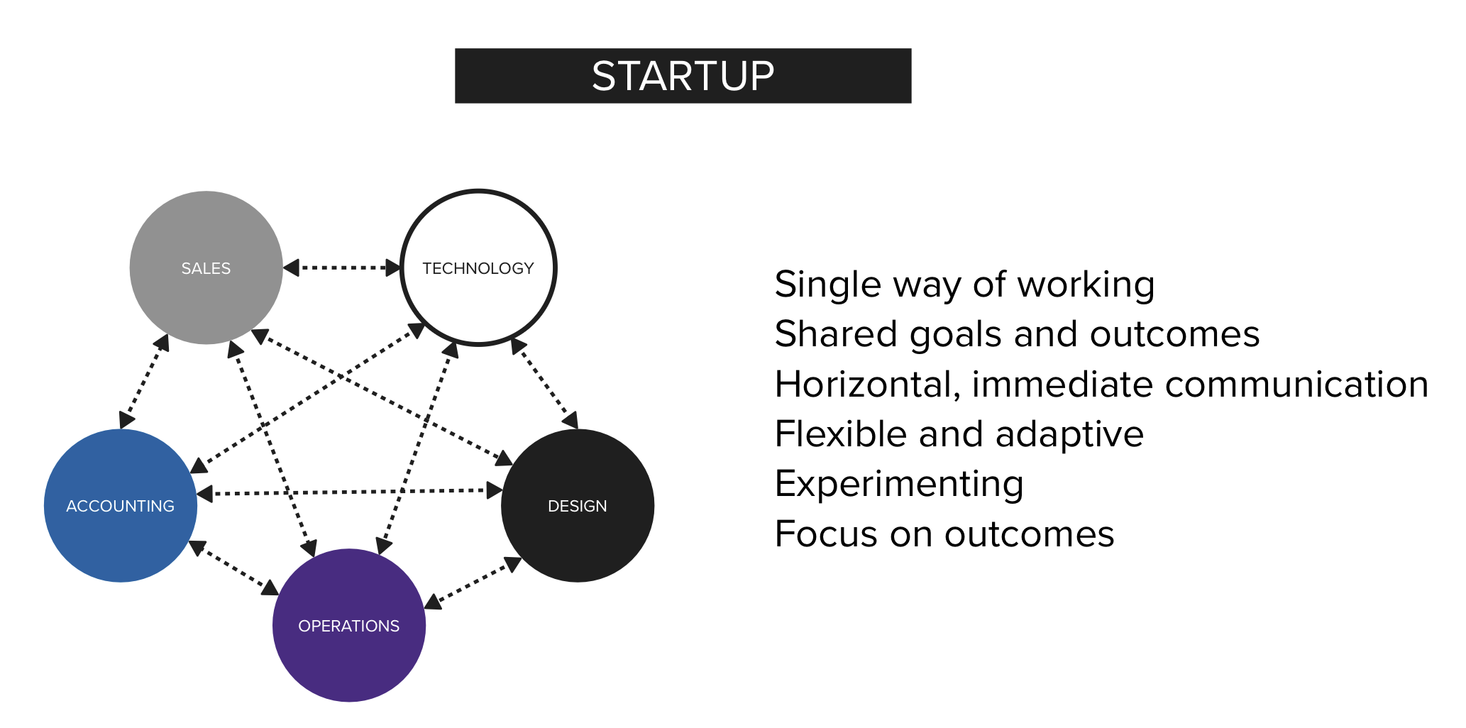 Early in a startup there are only a few people. Each has a specialty, but they work directly with one another to get the company running. The group functions as a small cross-functional team.