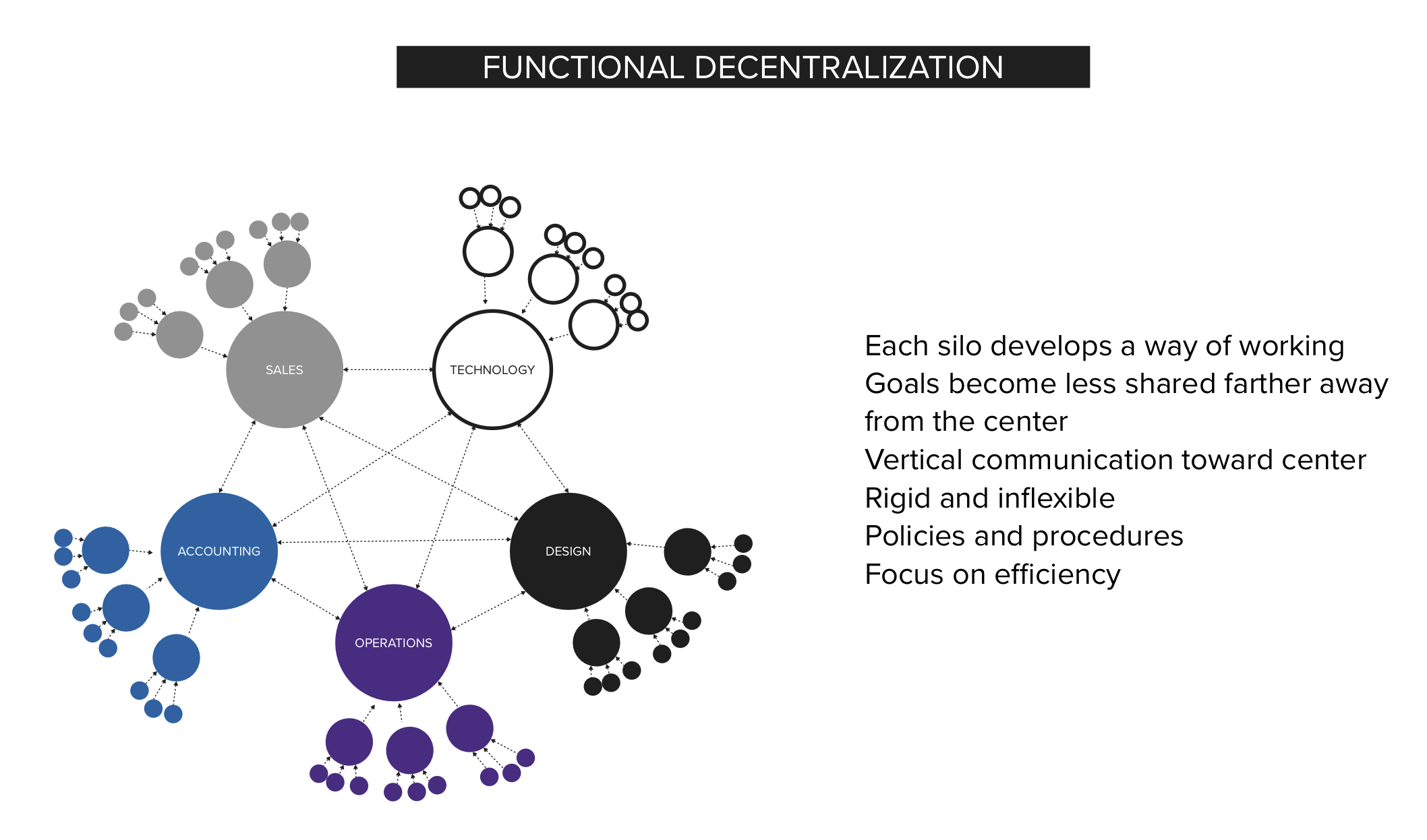 Functional Decentralization. As growth continues, direct collaboration is replaced by communication through management layers within each specialty. Decisions travel vertically inside departments rather than across the work itself. The silos continue to subdivide into more specialized groups. Policies and procedures are created to coordinate the growing structure. The goal is to scale while maintaining consistency and control. This structure improves local efficiency but increases dependency between teams.