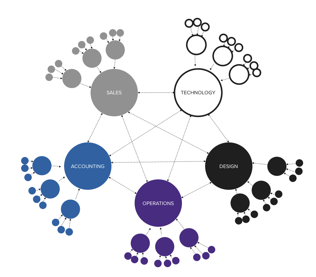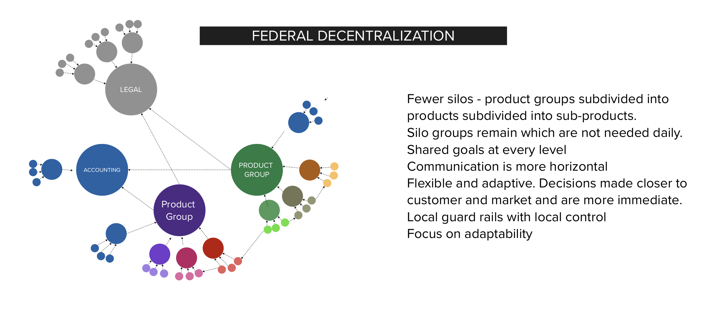Federal Decentralization. Instead of scaling through specialty divisions, the company organizes around products or value streams that operate as small businesses. Teams are formed around delivering customer value rather than specialization. Decisions are made within the group doing the work rather than moving up management chains.