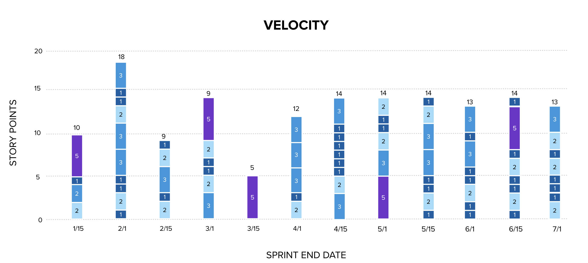 In this article, I will discuss a common defense of story point estimation called Velocity Variance. Below is a column chart showing the velocity of a software delivery team between January and the end of June of a year. Each item is represented as a colored block, the story point estimate of the work item is the number on the block. The total story points delivered each sprint is at the top of the column.