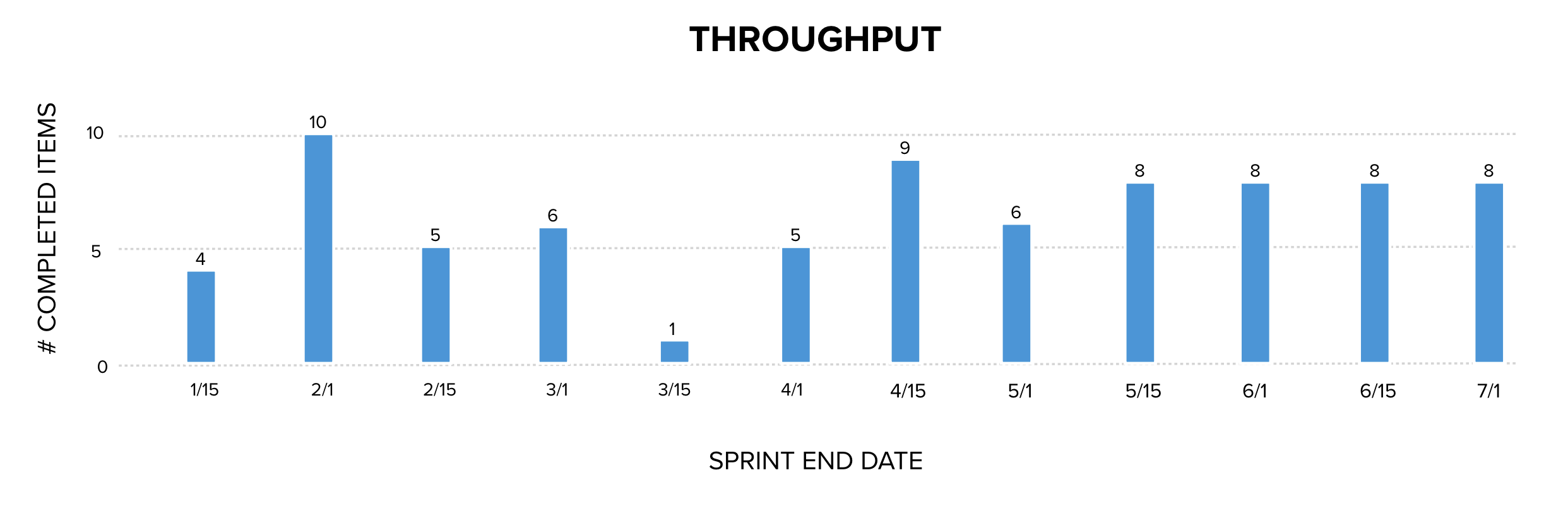 Without the sizes on each of the work items, instead we are now seeing observable facts about the number of things completed each sprint. Throughput is factual, historical data collected. Throughput is a useful measurement because it is one of the variables in Little’s Law that describes how work-in-process, cycle time, and throughput relate to one another in any process. Throughput is a valuable measurement that is collected and used in calculating Monte Carlo Analysis to predict the probability of completing a number of items by a range of dates. Monte Carlo Analysis is well-established in queueing theory and reliability engineering and is used in many industries to forecast system performance based on historical data.