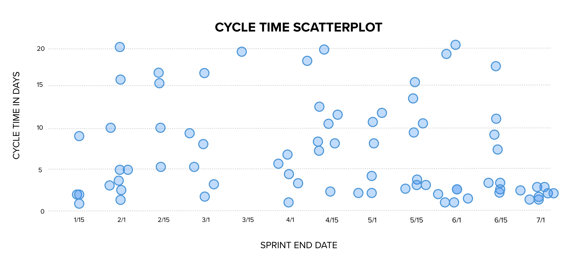 This chart appears on its surface to be data-driven and important. We can see how many things we delivered during each two week period (throughput), and we can see the size of each item.